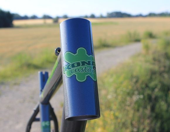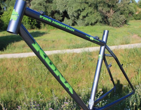 A complete facelift of the frame was done. I removed the old frame colour by sand-blasting the frame. Then I let painted the frame with primer/filler and so with the Audi Monsoon Grey Metallic colour. Custom Kona Fire Mountain decals are under a lacquer finish.