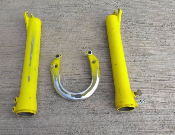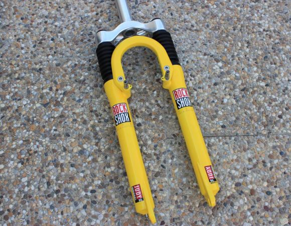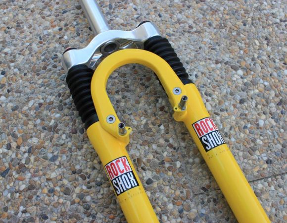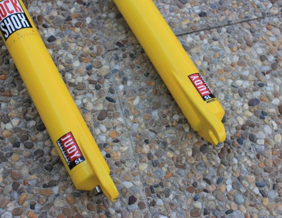 The forks have been upgraded and serviced with brand-new bushings, dust seal/wipers, coil springs (the old MCU springs were dead), and other seals. The hydraulic damper cartridge has been re-sealed and filled up with new Rock Shox 5wt oil. Moreover, I re-sprayed the magnesium lower legs, as well as the forks, and the brace in Rock Shox yellow. At the top of that, I put a brand new set of decals.