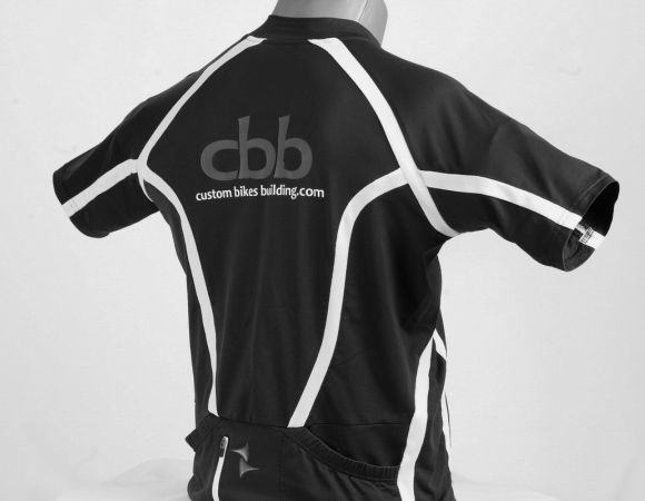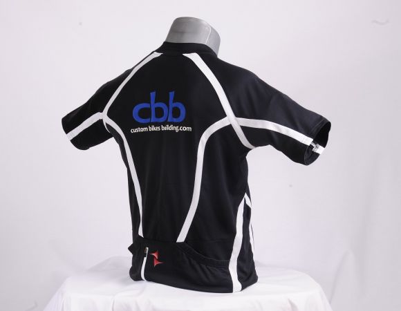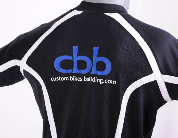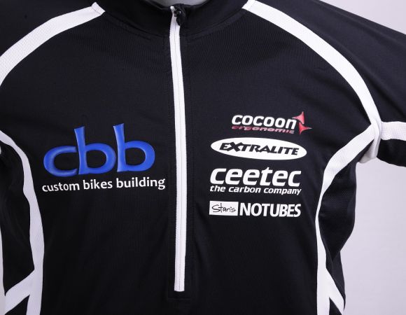 A cocoon ergonomic cycling jersey with short sleeves has been taken as my team jersey. It offers three pockets on the backside, one with a zip. I positioned my small team logo at the front left side of the jersey together with other company logos I recommend on my website. The backside wears my big team logo with a website URL address.