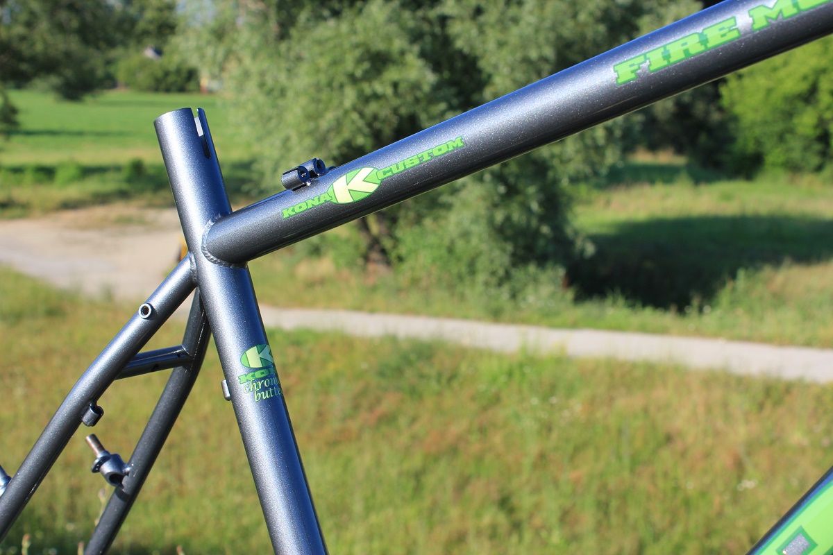A complete facelift of the frame was done. I removed the old frame colour by sand-blasting the frame. Then I let painted the frame with primer/filler and so with the Audi Monsoon Grey Metallic colour. Custom Kona Fire Mountain decals are under a lacquer finish.