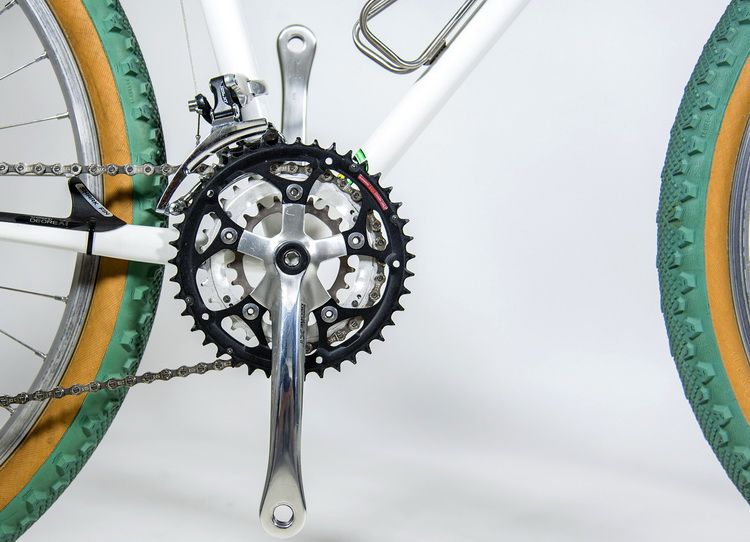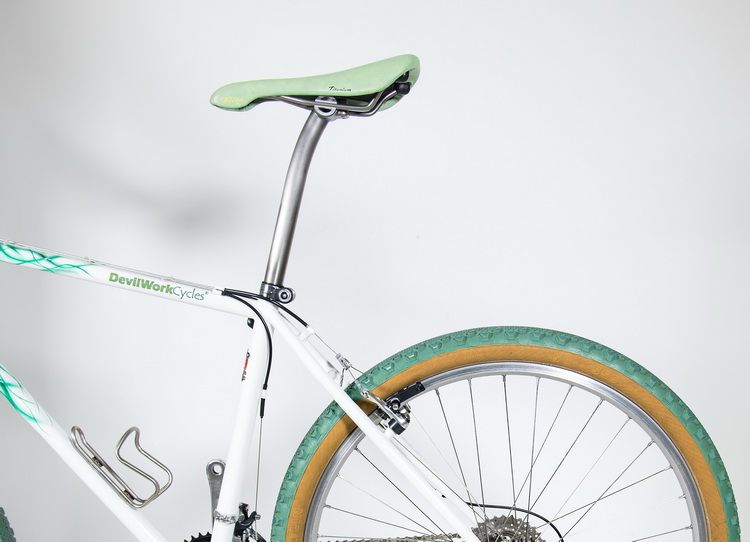 Základ bikeu zostal nezmenený. Klasický MTB rám pozváraný z kombinácie neprofilovaných oceľových trubiek Reynolds 725/853. Pripomeniem, že tento projekt sa realizoval na zákazku a za pomoci DevilWork Cycles z Banskej Bystrice. Súčasťou rámu je niekoľko "retro" vychytávok, ako je mostík uchytenia lanka a bowdenu zadnej cantileverovej brzdy. Pätky rámu dodali machri v obore spoza oceánu - Paragon Machine Works. Základné lakovanie rámu zostalo v bielej farbe s custom airbrushom v zelenom prevedení ala Michelin. Pribudli nové zákazkové nálepky DevilWork Cycles v custom dizajne.