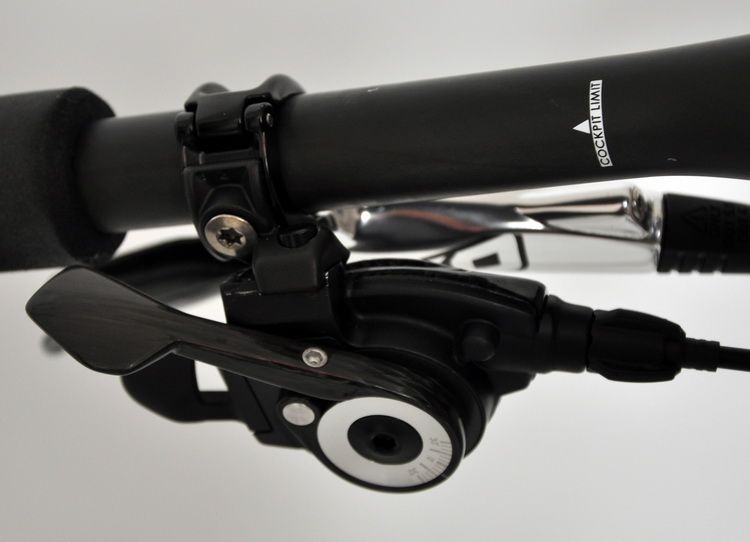 SRAM X.0 trigger shifters used with this setup were fixed together with the brake levers (using Matchmaker X clamps). The shifters have been tuned with carbon shifter levers (by Z-Components), the body and small parts re-anodized to black, and removed SRAM logo.