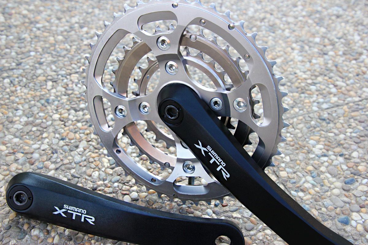 Náhoda tak chcela, aby sa mi opäť dostali do rúk staršie kľuky Shimano XTR FC-M952. Len tak, že či by som mal o ne záujem...a keďže už mám skúsenosti s reštaurovaním týchto kľúk, tie zmenili majiteľa a ja som sa pustil do práce. Obe kľuky boli v žalostnom stave (no po toľkých rokoch jazdenia), takže som nemal veľa práce s pôvodnou farbou (teda, takmer žiadna na nich nezostala). Všetky mechanické poškodenia som odstránil viacnásobným brúsením a leštením. A nasledoval elox...nie, pri týchto kľukách som zvolil novú povrchovú úpravu - teflón. Na výber som mal z viacero možností, nakoniec som zvolil variantu XYLAN 8840. Povrch kľúk je jemne drsný a temne čierny. Logo "Shimano XTR" bolo následne laserované priamo do teflónového povrchu. Samosťahujúce duralové matice boli re-anodizované do matnej čiernej farby. Na kľuky som namontoval originálne 4-ramenné prevodníky (všetky vo veľmi dobrom stave) a originálne Shimano skrutky.