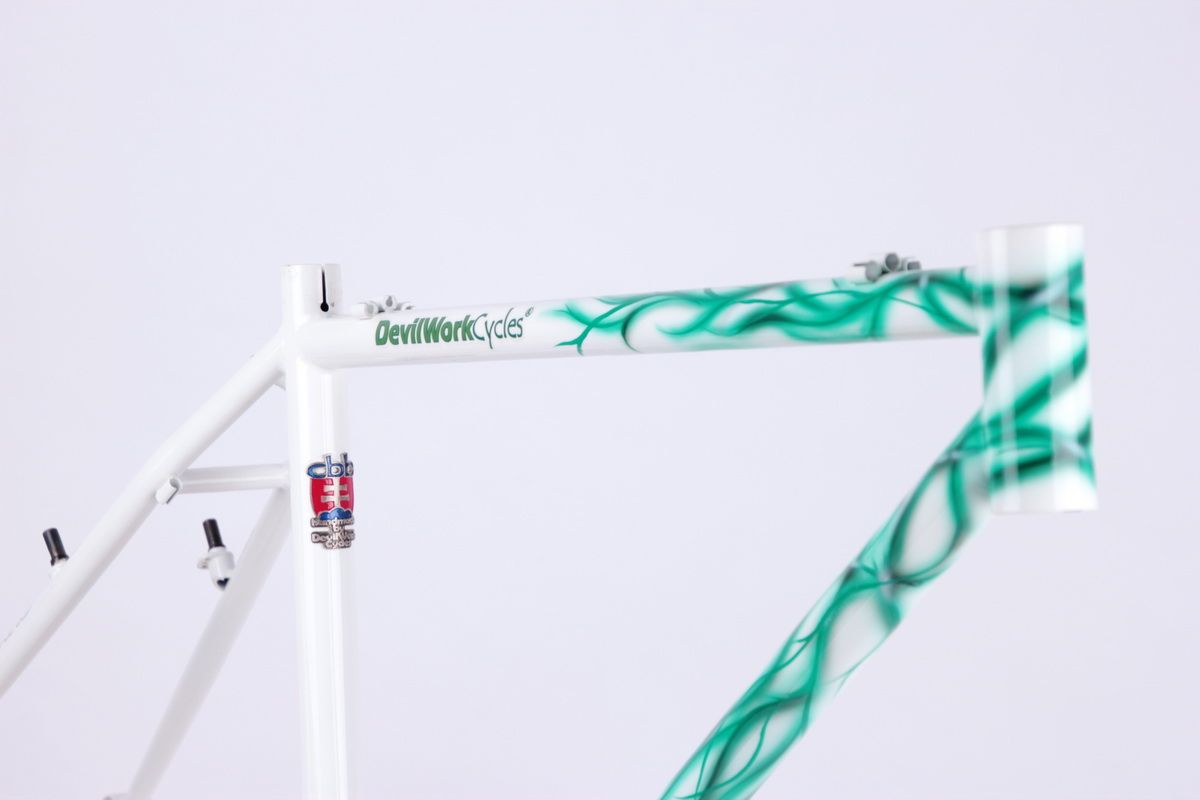 Rám sa lakoval základnou podkladovou a krycou bielou farbou. Nasledovalo lakovanie custom airbushu podľa zadania a finálne sa lakovanie rámu uzavrelo dvoma vrstvami ochranného laku.