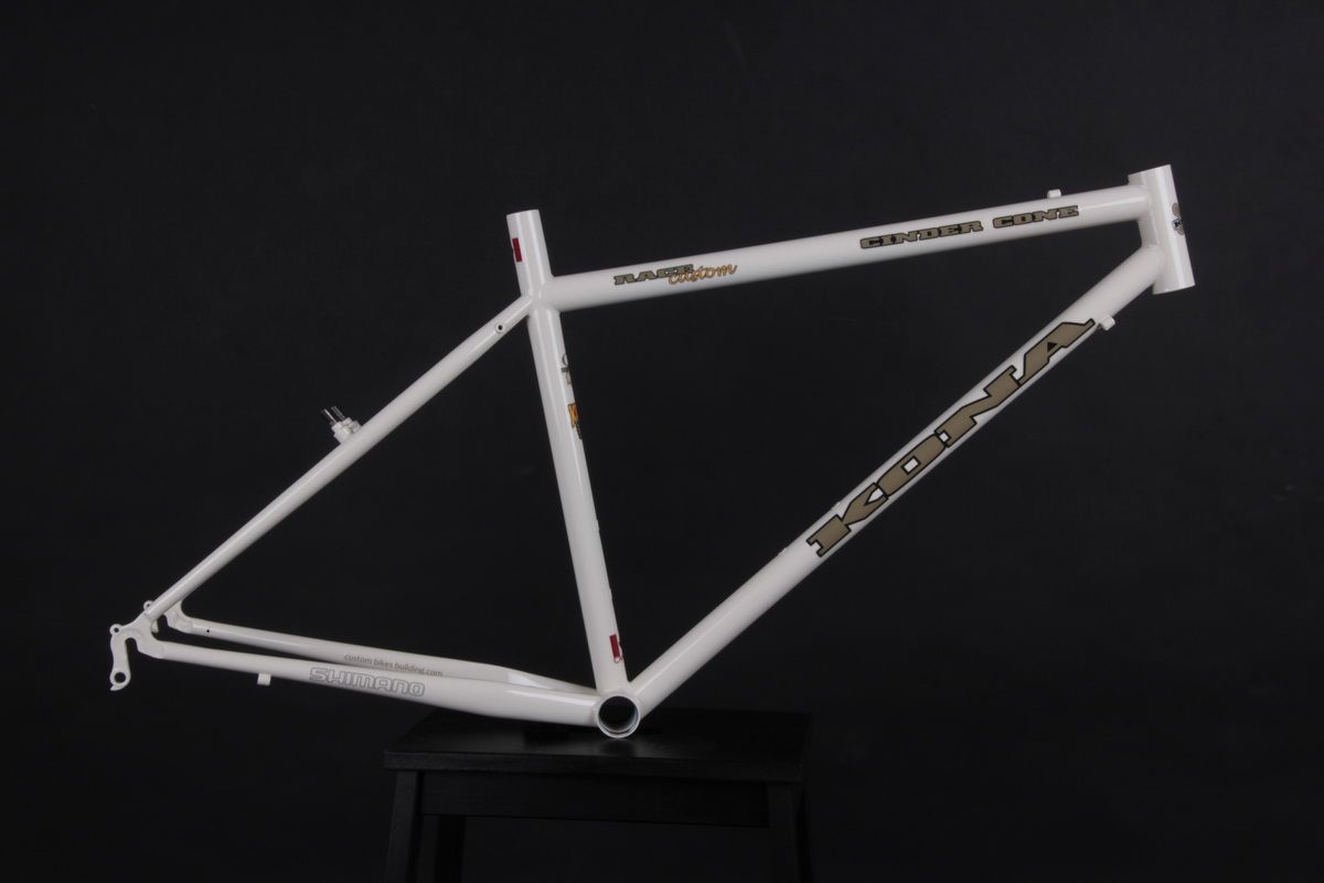 Rám i vidlica prešli kompletným "custom" faceliftom. Pôvodny, veľmi poškodený lak, bol odstránený pieskovaním a následne bol nastriekaný základnou bielou podkladovou a finálnou krycou slonovinou bielou farbou. Sadu nálepiek Kona Cinder Cone a Project Two "Joe Murray" som vyrobil sám a hoci podľa originálu, trochu som ich upravil. Všetky nálepky sú pod krycím lakom kvôli ochrane.